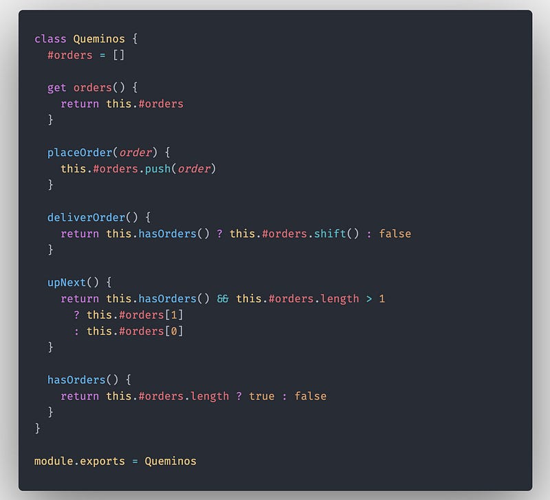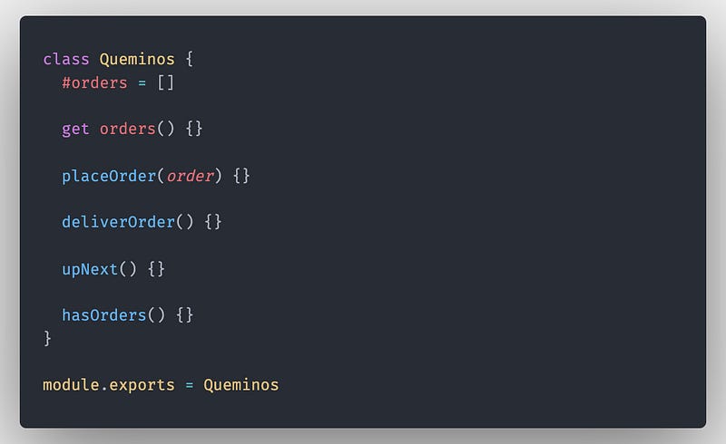 Here we’re using the class declaration to create the Queminos class. We then declare a private class property “orders” and set the value to an empty array. This would hold all the orders received by Queminos.