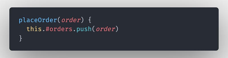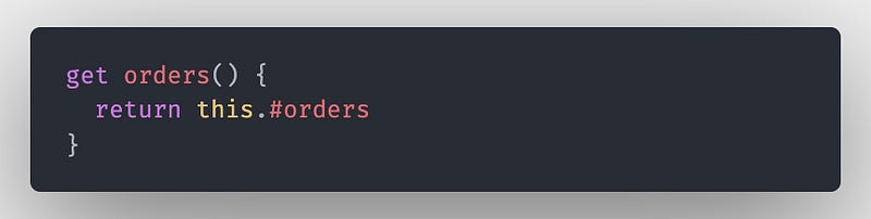 Since we’re unable to access/mutate the “orders” property outside the class (because it’s private), we’ll implement a getter method “orders” that returns the private “orders” property.