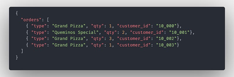 Our JSON data is pretty basic. It’s a list of received orders in object format. You could make it simpler and use strings if you wish.