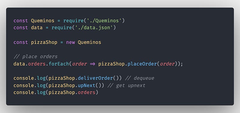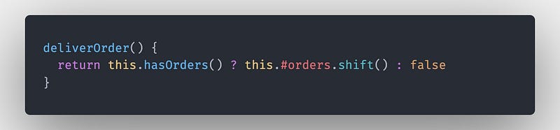 The deliverOrder method, which implements the dequeue method, removes the first element from the orders array (remember FIFO?). First, we use the hasOrders method to check whether there are any orders in the queue before attempting to remove any.