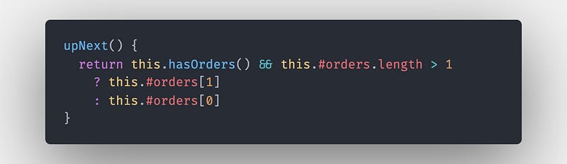 The upNext method, as mentioned earlier, returns the next order in the queue to be addressed. First, we need to check if there are orders, then check if there’s an order right behind the current one.