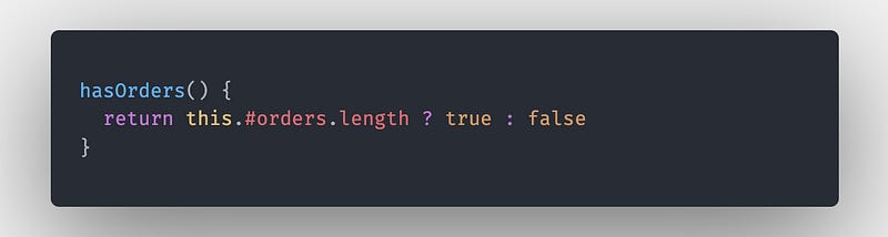 Finally, the hasOrder method checks whether the #orders array contains orders.